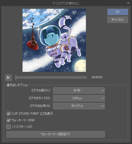 ウォーターマークとは透かしを入れることで、イラスト上に自分の名前やID、「AI学習禁止」などの文字やロゴを重ねて表示します。