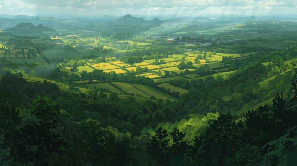 例えば手前の木は濃い緑色、中景の家並みは中くらいのトーン、遠景の山は青みがかった薄灰色…という具合に色調を分けると、一気に奥行きが生まれます。また、遠くは少しぼかすのも有効です。背景全体をほんのりぼかすだけでも遠近感が出て、画面がスッキリ見やすくなります。