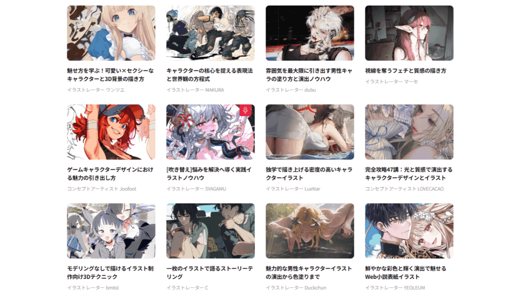 特に背景イラストに特化した講座は人気が高く、初心者~中級者向けに段階的にスキルアップできる内容が揃っています。構図やライティング、遠近法といった基礎理論から、実際のメイキングまで丁寧に解説されるので、独学では気づかなかったポイントも理解しやすいです。