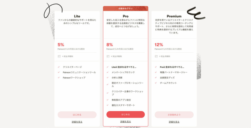 クリエイター側の手数料は収入の5~12%(プランによる)+決済手数料で、残りがおおむね取り分となります。他のプラットフォーム同様特別搾取が大きいわけではなく、比較的クリエイターに優しいです。FANBOXと違いプランではなく各支援者が自由な金額で支援する方式も選べます(ただ多くは月額〇ドルのティアを設定)。